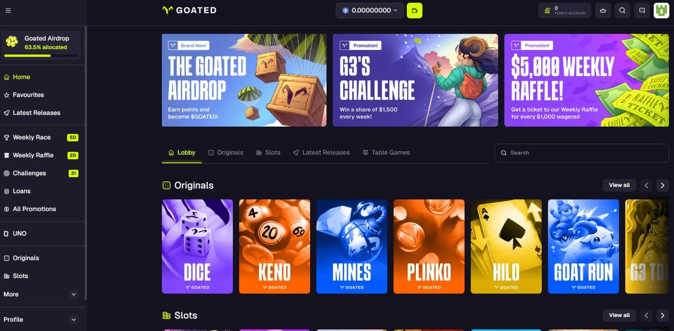Goated赌场有数千种游戏供玩家选择,包括老虎机、桌面游戏和真人荷官游戏。